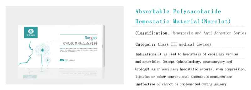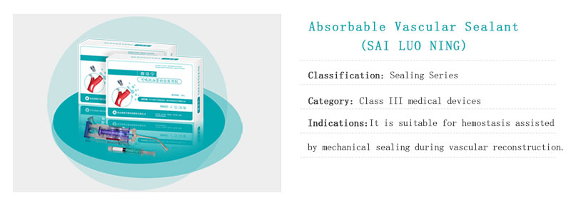We have been committed to the localization of Advanced medical consumables, and are at the domestic leading level in the fields of hemostasis, anti adhesion, tissue sealing and protection, interventional embolization, etc. At present, We have been approved to register and produce 22 medical device products, and 3 foreign agent medical device products, including 11 class III medical device products, 12 class II medical device products, and 2 class I medical device products. The main product material categories include: hemostasis and anti adhesion series, closure series, interventional embolization series, reinfusion and drainage series (foreign agent products), oral series, surgical nursing series, allergy barrier series, first aid series, delivery series and other products. The products and theirs application scope are as follows: