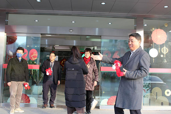 公司董事长邹方明、总经理戴永强及总经理助理级别以上领导提前来到公司,在办公楼门前迎接每一位员工,将诚挚的新春祝福送给大家。