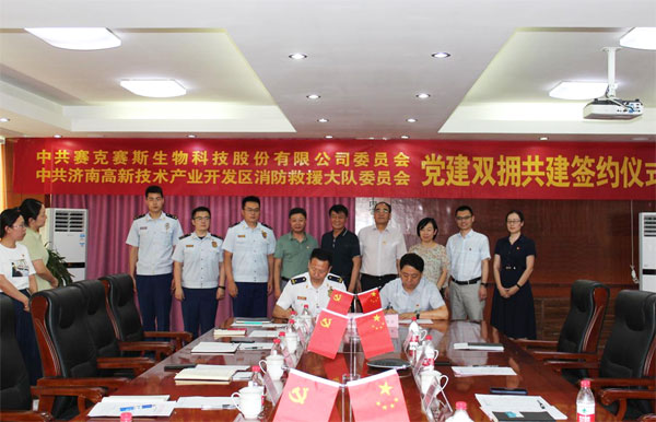 2022年6月22日,中共赛克赛斯生物科技股份有限公司委员会、中共济南高新技术产业开发区消防救援大队委员会“党建双拥共建”签约仪式活动在赛克赛斯办公楼三楼会议室隆重举行。济南高新区消防救援大队党委书记、政治教导员赵立洲,党委委员、副大队长韩振华参加签约活动;赛克赛斯党委书记、董事长邹方明,党委副书记张传军参加签约活动;济南高新区齐鲁软件园综合党工委委员张鼎华,齐鲁软件园万达片区党委党建指导员宋星鹏出席并见证签约活动。本次签约活动由赛克赛斯党委副书记张传军主持。