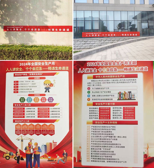 在公司厂区悬挂“人人讲安全 个个会应急——畅通生命通道”的宣传横幅;通过各种方式,营造“安全生产月”活动氛围,时时警醒每位员工要将安全放在第一位,并切实履行好自己的安全职责。