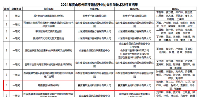 近日,山东省医疗器械行业协会公布2024年度“山东省医疗器械行业协会科学技术奖”评审结果,赛克赛斯生物公司的“角膜表面粘弹保护剂”项目荣获科学技术奖一等奖。