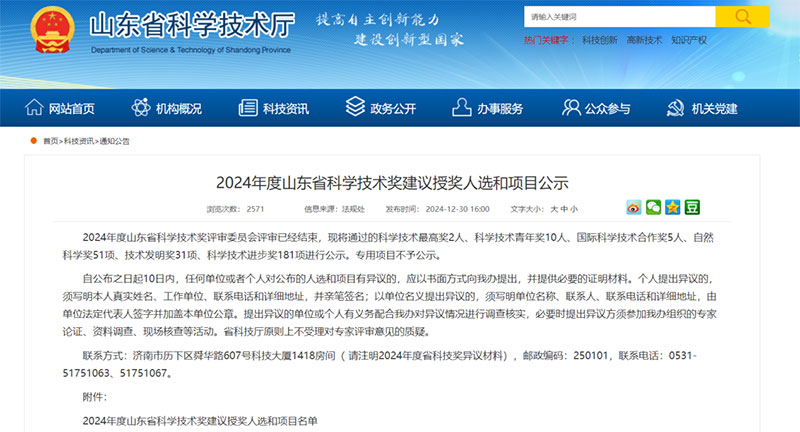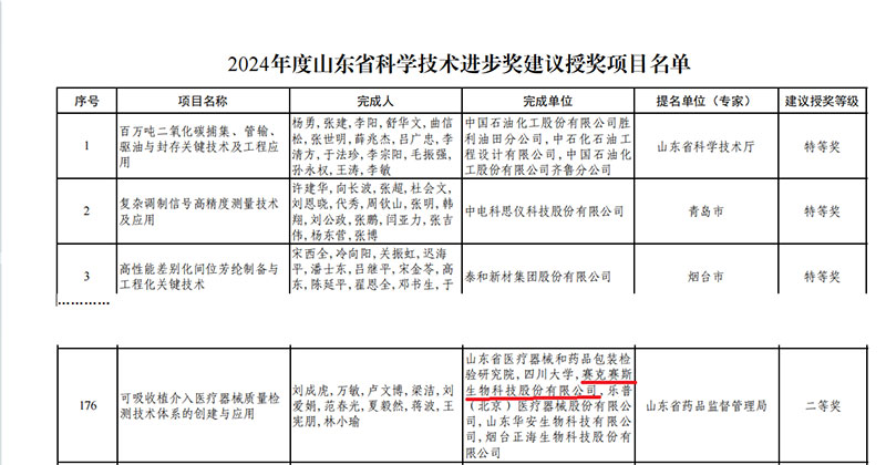 近日,山东省科技厅公布《2024年度山东省科学技术奖建议授奖人选的项目公示》,赛克赛斯生物科技股份有限公司作为参与单位之一完成的“可吸收植介入医疗器械质量检测技术体系的创建与应用”项目荣获2024年度山东省科技进步二等奖。