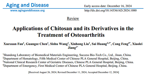 近日,技术中心研究员樊学轩撰写的学术论文“Applications of Chitosan and its Derivatives in the Treatment of Osteoarthritis”在国际知名期刊《Aging and Disease》上正式发表,全文链接https://www.aginganddisease.org/EN/10.14336/AD.2024.1080。公司技术中心姜晓蕾博士、解放军总医院冯聪博士和黄赛博士为该文章的共同通讯作者。