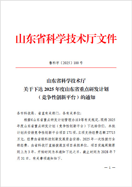 公司入选《2025年度山东省重点研发计划(竞争性创新平台)》更新时间:2025-07-31 作者:项目申报办 赵丽丽 浏览次数: