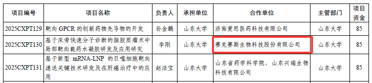 近日,山东省科技厅发布《关于下达2025年度山东省重点研发计划(竞争性创新平台)的通知》(鲁科字〔2025〕100号),赛克赛斯生物科技股份有限公司作为合作单位与山东大学齐鲁医院联合申报的“基于床旁快速分子诊断的脑胶质瘤术中局部靶向载药水凝胶研发及应用研究 ”项目成功入选。