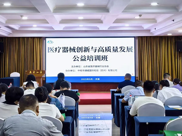 2025年9月9日,由山东省医疗器械行业协会主办、中检华通威国际检验(苏州)有限公司协办的“医疗器械创新与高质量发展”公益培训班在济南成功举办。山东省药品监督管理局医疗器械监督管理处副处长付凯、山东省食品药品审评查验中心审评三部部长柴谦等领导出席了本次培训班,来自省内医疗器械相关单位从事新产品研发、注册、生产管理、成果转化岗位的60多位代表参加了本次培训。