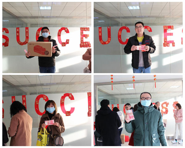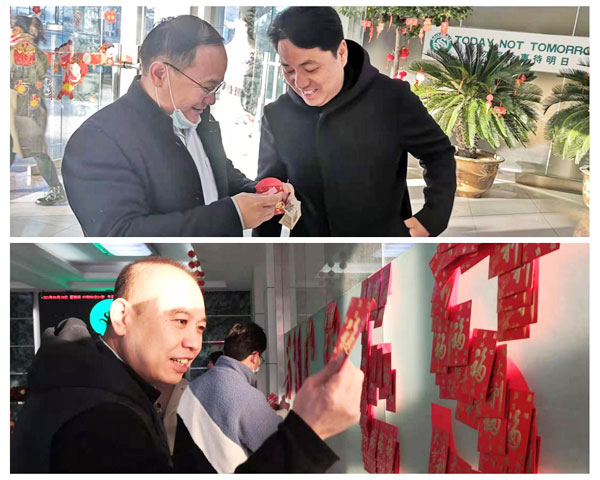 因为疫情原因,公司没有再组织大型的团拜活动,董事长带领公司领导层来到每个部门给大家拜年,“过年好,过年好,新年快乐!”一声声祝福传递到了公司的每个角落。