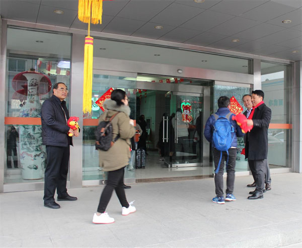 公司董事长邹方明提前来到公司,在办公楼前迎接每一位员工,将诚挚的新春祝福送给大家。