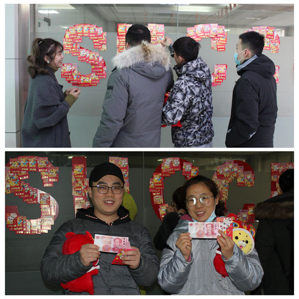 一楼大厅内进行着简约而又喜庆的“开年利是”活动,每一位员工在进入工作岗位之前都可以在红包墙上抽取一个红包,讨个新年好彩头;都可以领取一个虎年吉祥物,象征着新的一年如虎添翼、虎虎生威。