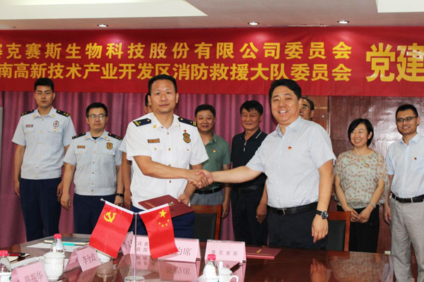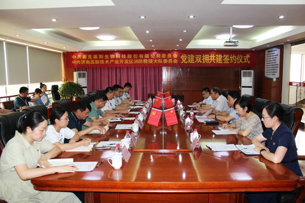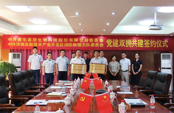 2022年6月22日,中共赛克赛斯生物科技股份有限公司委员会、中共济南高新技术产业开发区消防救援大队委员会“党建双拥共建”签约仪式活动在赛克赛斯办公楼三楼会议室隆重举行。济南高新区消防救援大队党委书记、政治教导员赵立洲,党委委员、副大队长韩振华参加签约活动;赛克赛斯党委书记、董事长邹方明,党委副书记张传军参加签约活动;济南高新区齐鲁软件园综合党工委委员张鼎华,齐鲁软件园万达片区党委党建指导员宋星鹏出席并见证签约活动。本次签约活动由赛克赛斯党委副书记张传军主持。