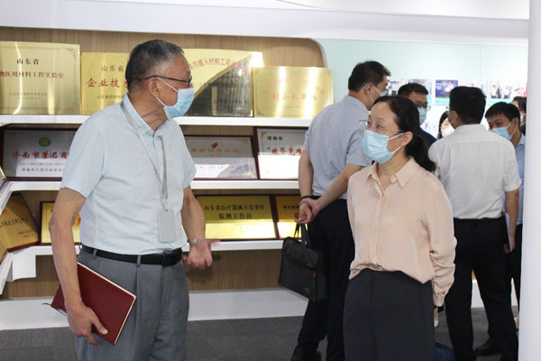 在参观完展厅后,来访领导在柏总等人的陪同下参观了手术防粘连液生产车间,车间主任对该产品的生产流程进行了简单介绍,省药监局医疗器械处现场检查人员重点说明了合规检查的流程和内容,并在检查过程中介绍了公司培训考试系统使用以及唯一标识系统的应用情况。