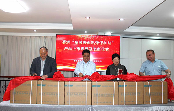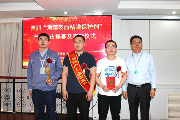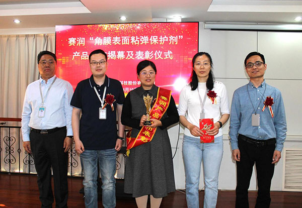 在全体参会人员的热烈掌声中,董事长邹方明、副总经理邹方钊、总工程师赵成如、研发项目组长刘常琳为赛润“角膜表面粘弹保护剂”产品上市剪彩。随后,邹方明董事长向为赛润产品上市做出突出贡献的相关部门颁发荣誉绶带、荣誉奖杯及奖金。